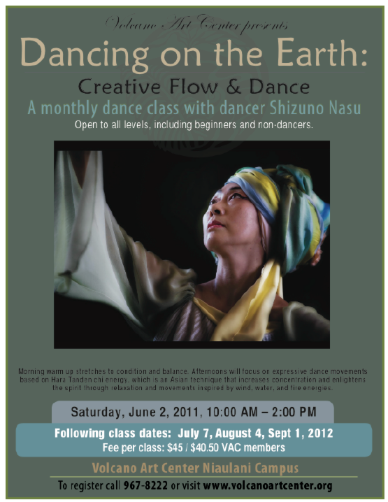 Volcano, HI – Volcano Art Center celebrates creative dance with internationally renowned and classically trained dance artist Shizuno Nasu. The exuberant praise for Nasu’s 2011 spring dance and movement classes was the only prompting needed for Volcano Art Center to collaborate with her on a new summer series to begin in June.