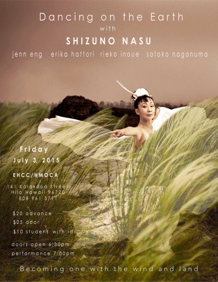 Shizuno Nasu embodies the Asian spirit and Hawaii's powerful nature. Integrating F'u Sui Ka, the movements of swaying in the wind, the flowing of water, and the flaming and flickering of our inner energy, as well as her original spiral movements, Shizuno Nasu and company become one with the elements. Thru creative and completely improvised dance and conscious breath, this company of artists blend the extremes of big nature and the gentleness