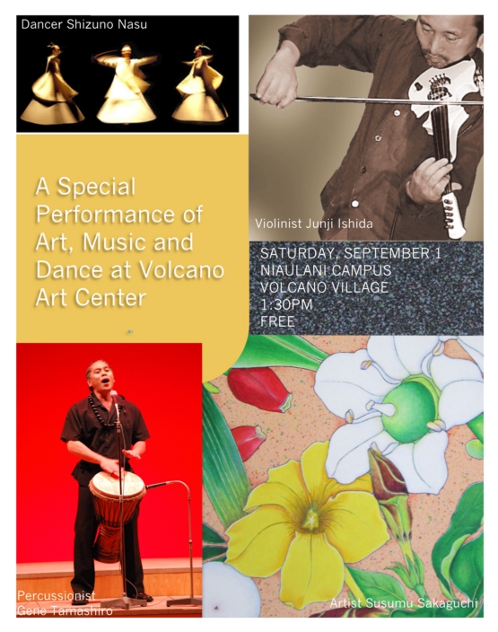 Dancing on the Earth with Shizuno Nasu is a four-part series that begins on Saturday, June 2. Subsequent classes will be held July 7, August 4 and September 1. All classes are open to all levels – including beginners and non-dancers – and will be held from 10:00 a.m. to 2:00 p.m. at the Volcano Art Center’s Niaulani Campus in Volcano Village. Tuition is $45 or $40.50 for VAC members for each session. Class size is limited and pre-registration is required. For more information, visit www.volcanoartcenter.org <http://www.volcanoartcenter.org> or contact Julie to register at (808) 967-8222 or julie@volcanoartcenter.org <mailto:julie@volcanoartcenter.org> .